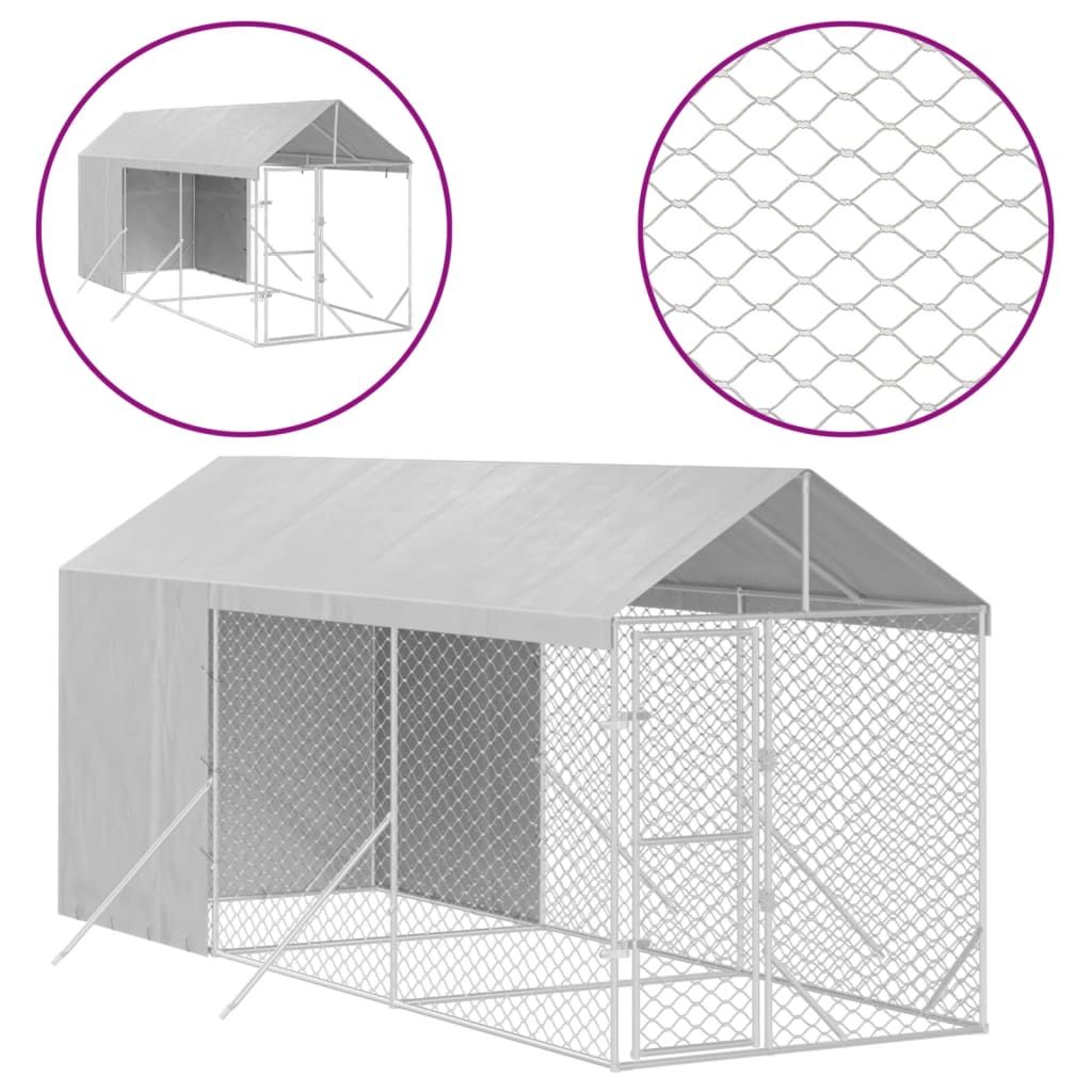 This outdoor dog kennel offers a solid solution for keeping your pets secure, letting them have a spacious and comfy space to hang out. The sturdy galvanized steel frame protects them from harsh weather, while the polyethylene roof shields against rain and sun. It's a perfect choice for outdoor areas, with its sleek silver look blending seamlessly with your garden and adding a touch of style.