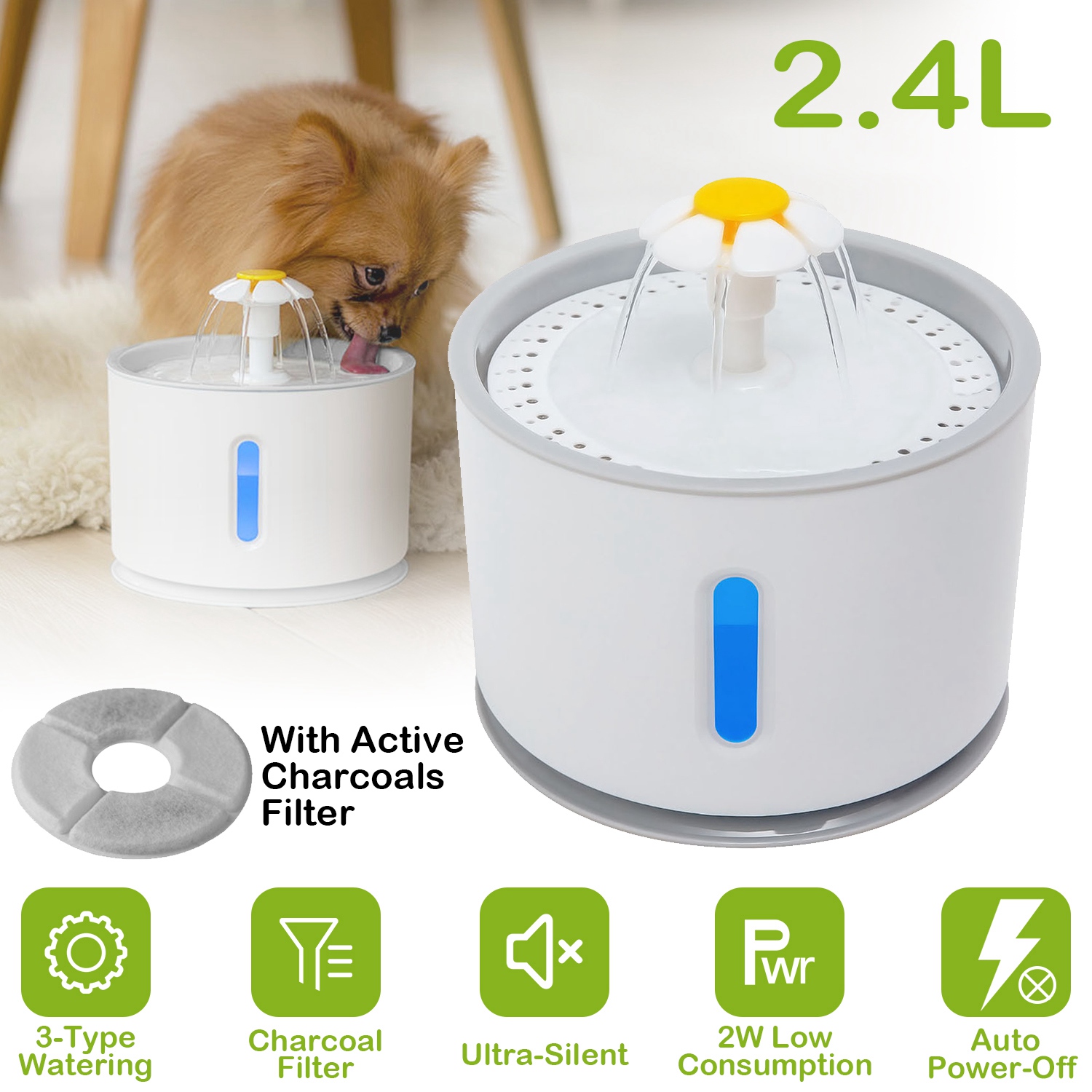 Are you looking for a strong but hygienic fountain to solve the drinking problem of your pet cat or dog? Our automatic daisy flower-shaped fountain may meet your needs. It comes with 2.4L large water capacity to effectively decrease the frequency to replenish water and ease your time and can provide 3 watering types (waterfall style, gush style and waterfall-gush style) to attract and pleasure your pet to drink. Built-in a LED light and a visible window, it can allow you to see the water level conveniently and designing an auto power off function in water shortage state to ensure your pet and the fountain safe. Additionally, it owns a cocoanut shell active charcoal filter to ensure the purity of the water by effectively removing the hair of you cat, bad odor, adverse chlorine and heavy metal contained in the water.