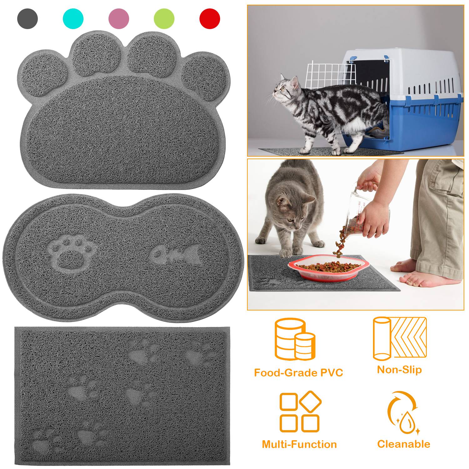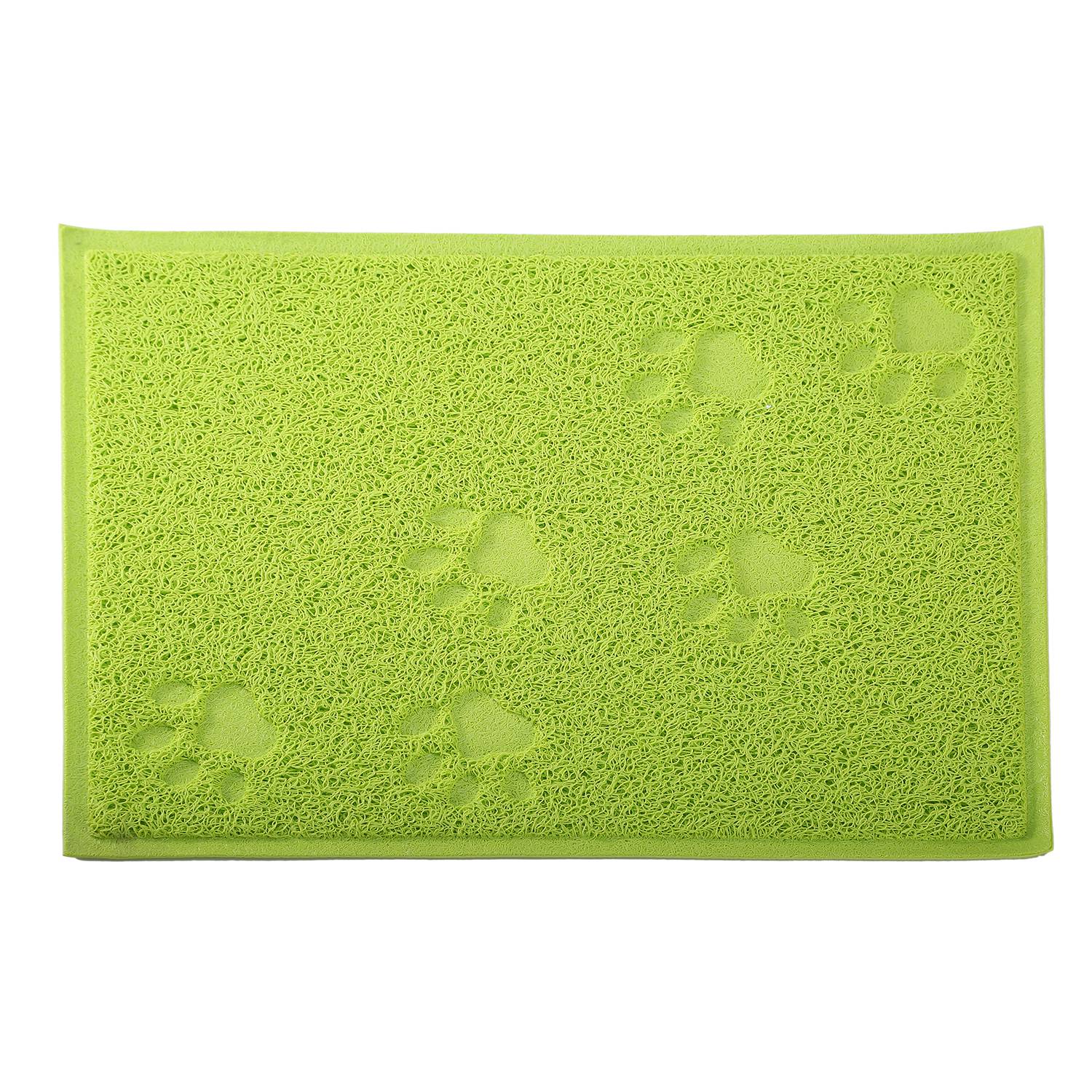 Our pet feeding mat adopts food-grade dense ring-shaped PVC fiber materials, non-toxic, soft, sturdy, durable, abrasion resistance and meantime, can grip the litters tightly to avoid any mess. Overspreading floor-friendly textures and suctions on its back, it is non-slip. It has multiple functions to be used as placemat, litter catcher mat, indoor or outdoor welcome mat, etc.